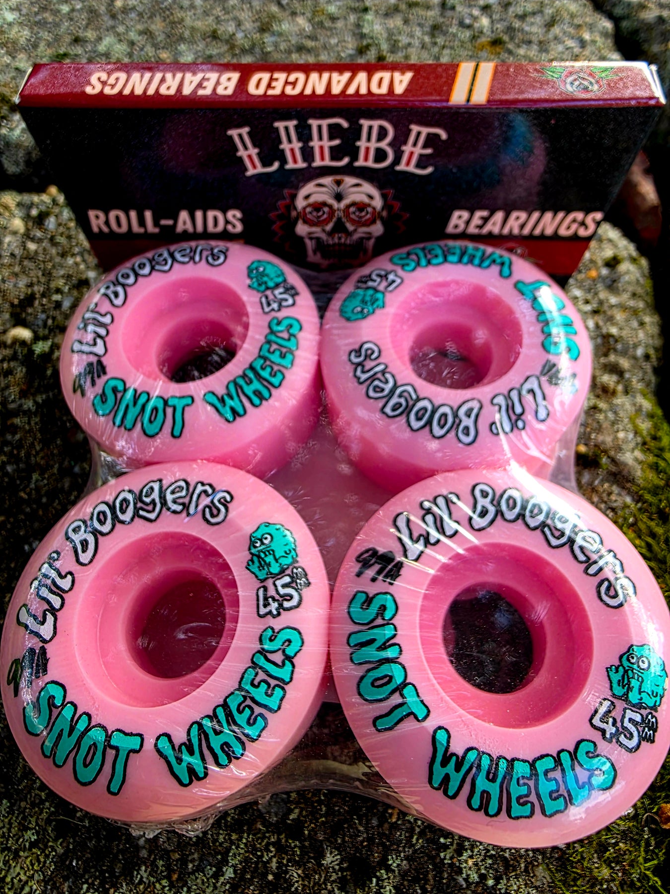 Tiny but mighty. Liebe Skateboards is now carrying the Snot Wheels Lil Boogers — some of the smallest wheels on the market at 48mm and 45mm. Born from the creative mind of Mark “Fos” Foster (Heroin Skateboards), these wheels are perfect for tech tricks, quick pops, and anyone who wants their setup to feel lightning-fast and ultra-responsive.